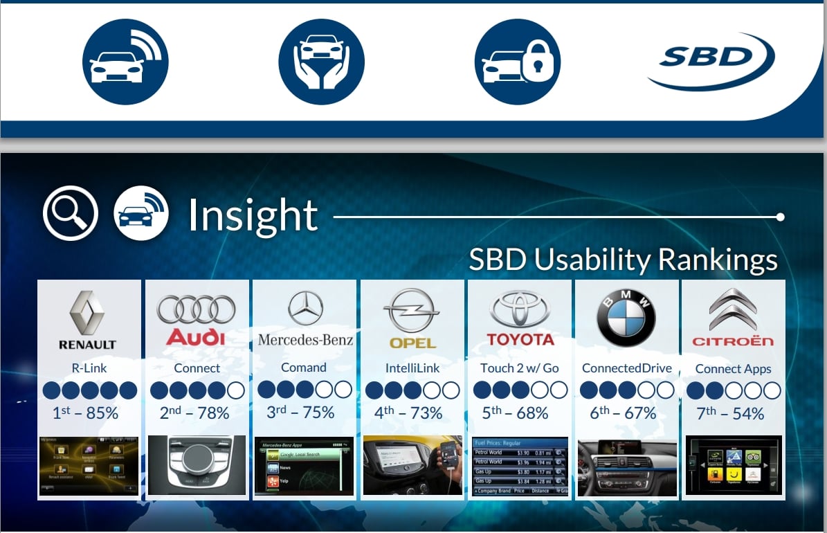 Le cabinet britannique SDB spécialisé en automobile a donc attribué la première place au système Renault comme étant le système le plus simple d’après un panel d’utilisateur. On remarquera que le système se classe devant le Connect d’Audi qui est souvent apprécié par les spécialistes. C’est le système PSA qui ferme la marche de ce classement.