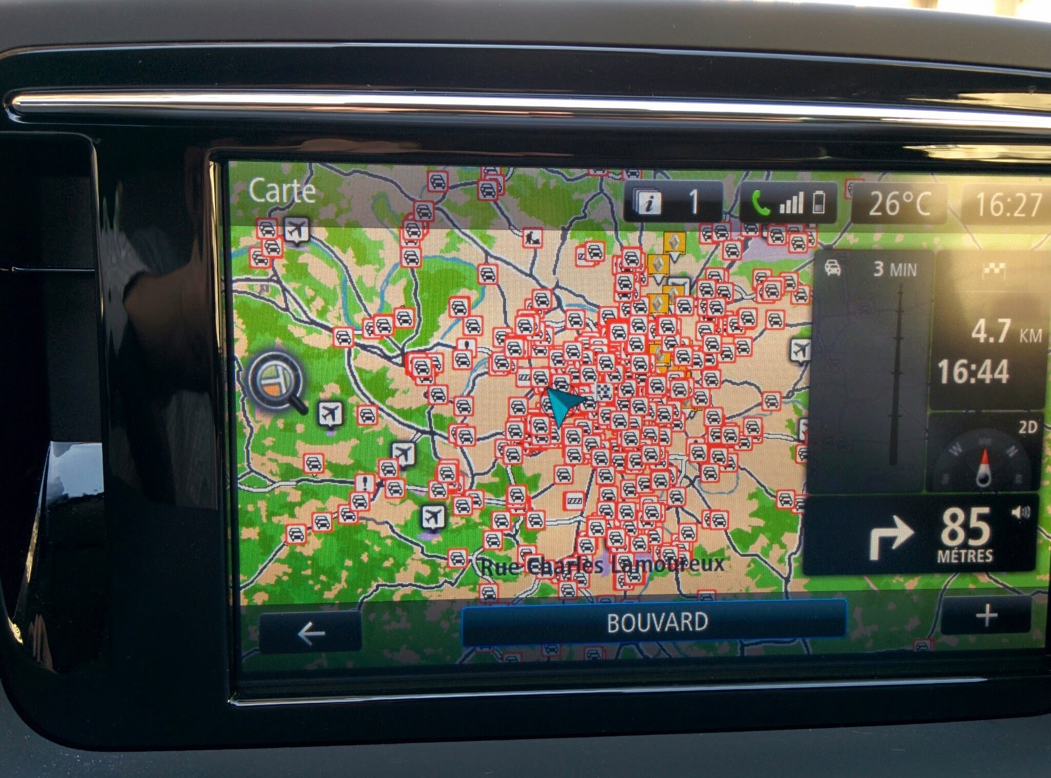 En tout cas le système était bien plus réactif que lors de mon premier essai et le bug d’affichage de la carte de Paris avait disparu, tout comme les icones de notification incorrect dans certaines Apps. On a pas la fluidité d’un smartphone (difficile avec ce processeur) mais il y a du mieux. Je n’ai pas constaté de crash ni de déconnexion lors de mon périple (500 km) et le guidage était efficace. L’info trafic Live était opérationnel, voici une carte de Paris pendant les grèves. La carto n’était pas récente puisque le périph est encore à 80 km/h, dommage.
