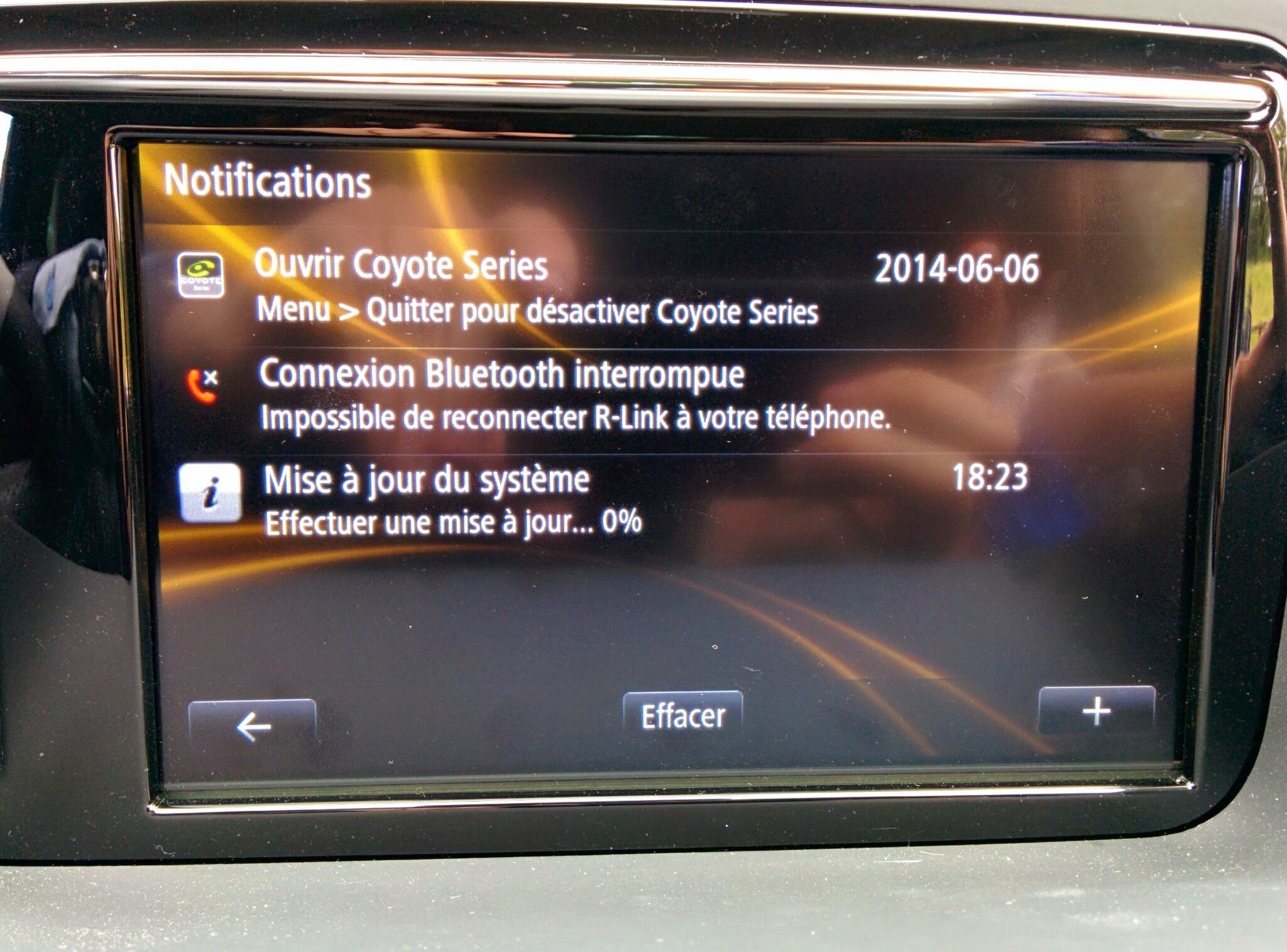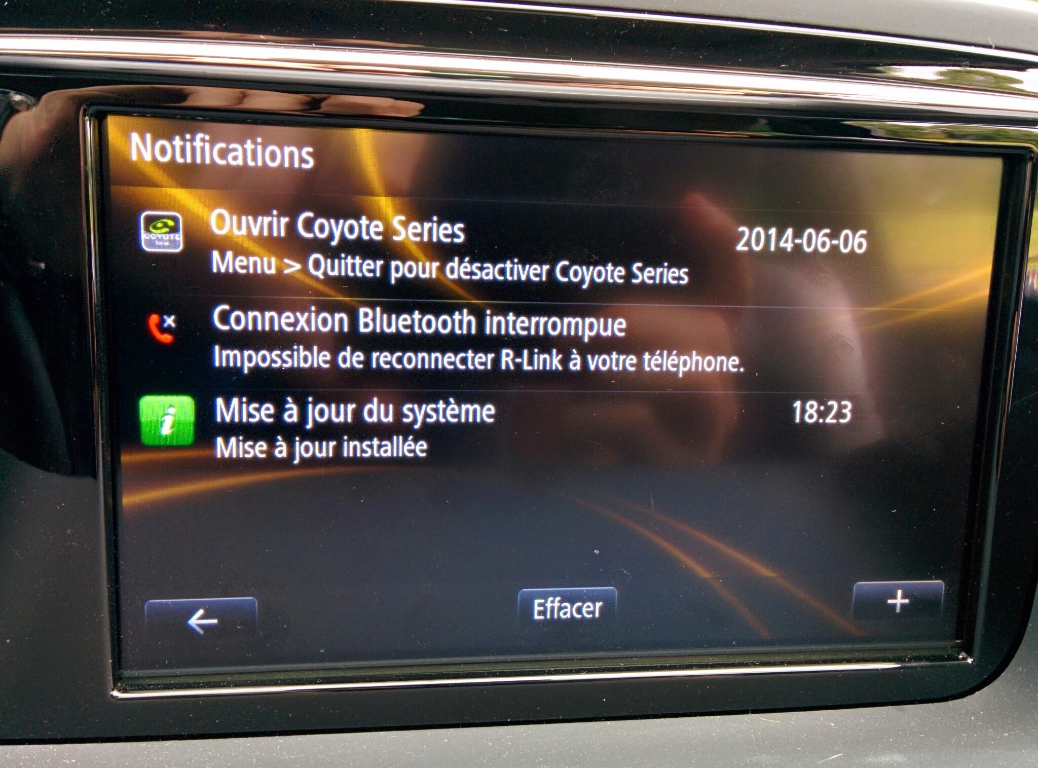 Avoir l’application Coyote directement intégré au système est appréciable : inutile de rajouter un boitier ou un smartphone sur la planche de bord avec le fil qui pendouille ! Par contre toujours impossible de mettre le widget du Coyote sur l’écran d’accueil. Si on veut voir les informations de l’application il faut la passer en plein écran et adieu les indications de guidage ! L’application passe aussi en plein écran en cas d’alerte, masquant là aussi la carte. En cas d’alerte je verrai bien une pop-up sur une partie de l’écran mais pas sur la totalité ! L’écran est suffisamment grand pour satisfaire les 2 applications. Aucune personalisation de l’écran d’accueil n’est possible sur une Mégane GT, il n’y a que le widget Audio.