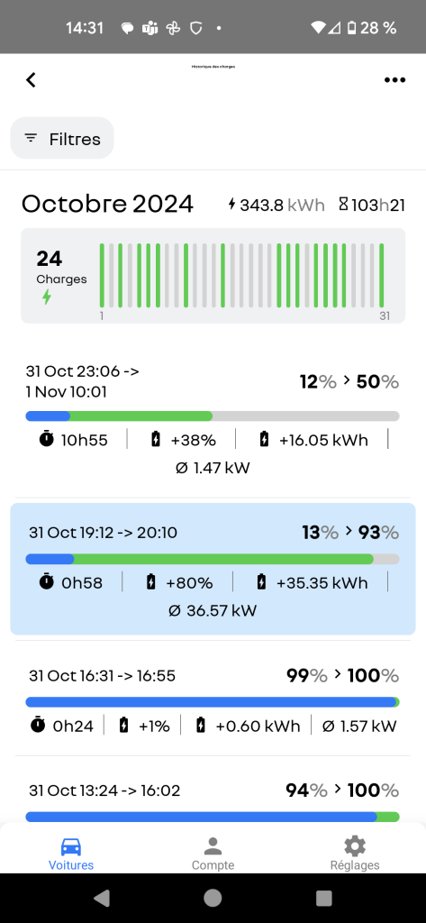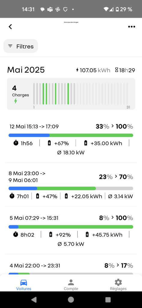 - Un affichage super sympa de l’historique de charge (avec la puissance moyenne de chaque session de charge).