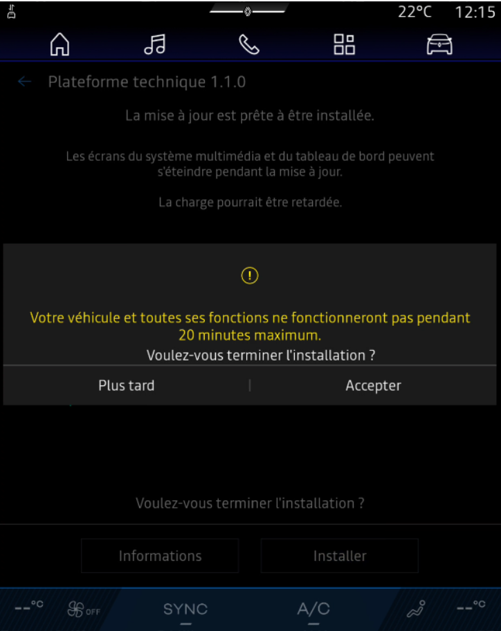 Exemple d’écran qui s’affiche à la coupure du moteur quand la mise à jour est prête à s’installer. Il suffit de se laisser guider en validant et de quitter le véhicule.